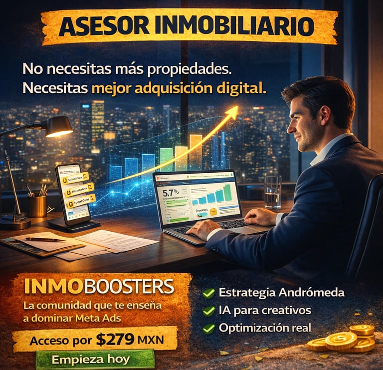Es una comunidad privada para asesores inmobiliarios donde aprenderás a estructurar, lanzar y optimizar campañas de Meta Ads con el Método Andrómeda y recursos prácticos listos para implementar.