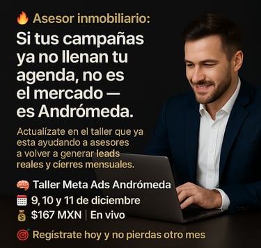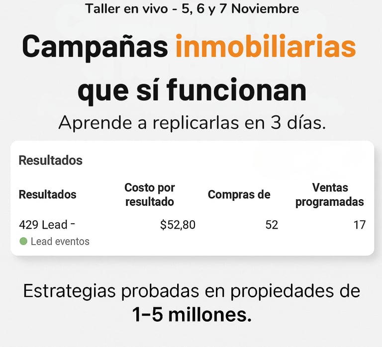 En 3 días intensivos te mostraré el paso a paso para crear campañas que realmente generan leads calificados y citas agendadas, usando el mismo sistema que ha funcionado para inmobiliarias en México con propiedades de 1 a 7 millones de pesos.