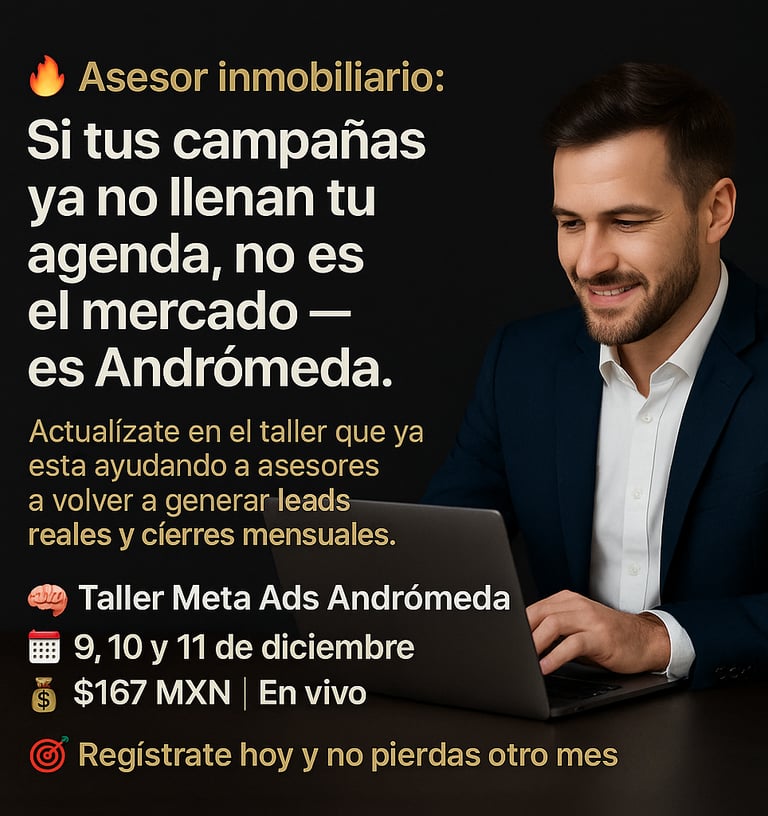 Descubre en 3 días intensivos (9, 10 y 11 Dic) la metodología paso a paso que usan los inmobiliarios más exitosos de México para vender propiedades de 1 a 7 millones de pesos con campañas digitales que funcionan.