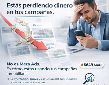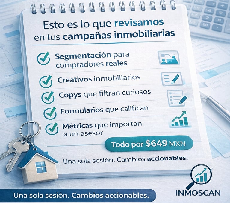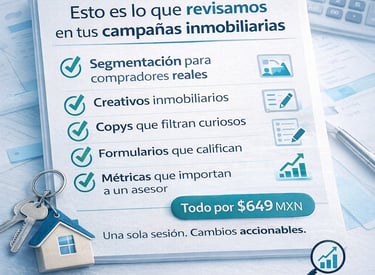 Por solo $649 MXN obtienes un diagnóstico profesional de tus campañas inmobiliarias en Meta Ads, con observaciones claras, correcciones específicas y una ruta de acción basada en lo que hoy sí convierte en ventas reales.