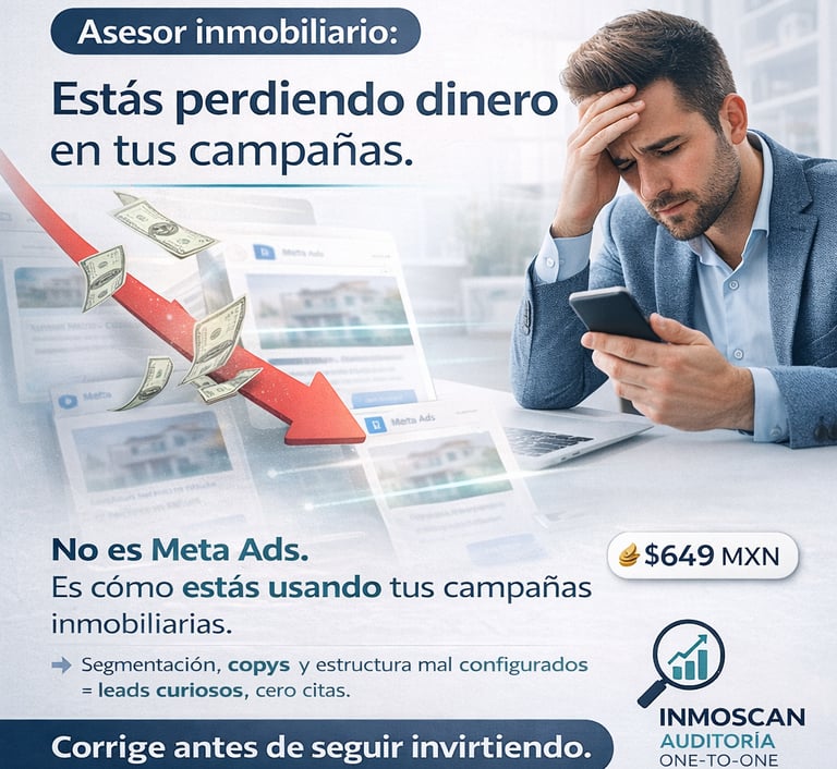 InmoScan es un servicio de auditoría especializada en Meta Ads inmobiliarios, diseñado para analizar tus campañas activas y detectar exactamente qué está impidiendo que generen citas y ventas reales.